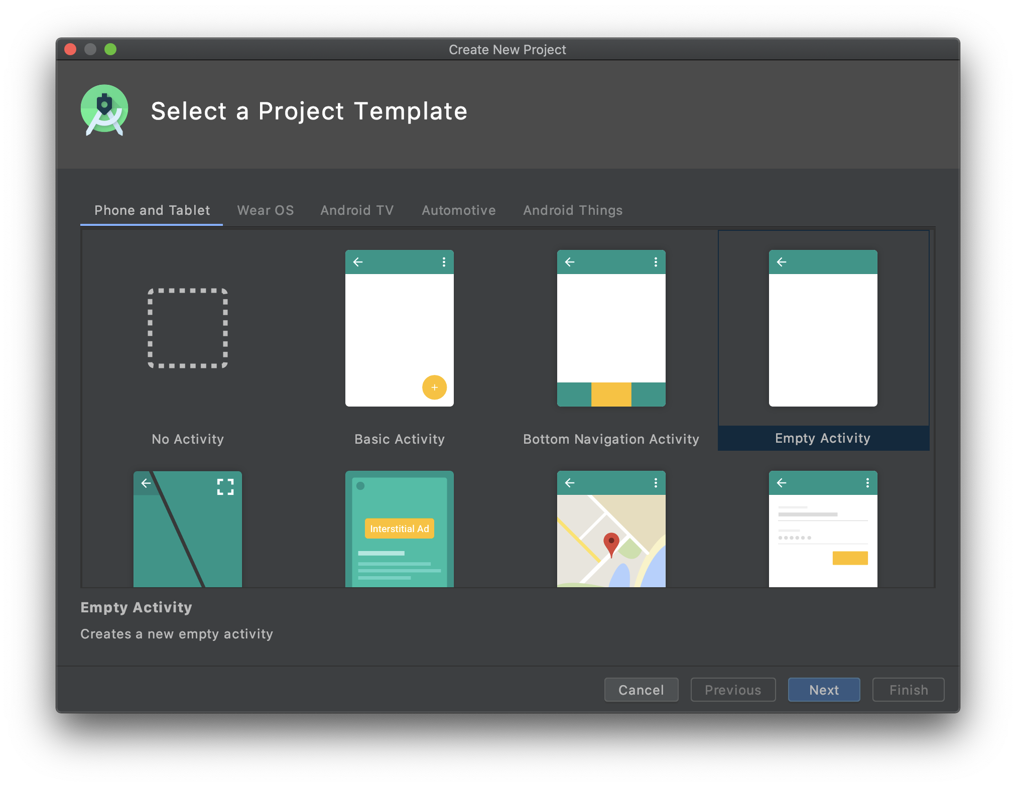 - Select an Empty Activity Project Template. This would create an empty Android project.