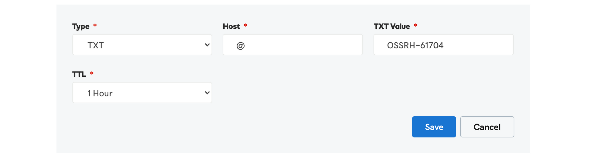 Type: TXT | Host: @ | TXT Value: [your ticket reference in Sonatype Jira] | TTL: 1 Hour