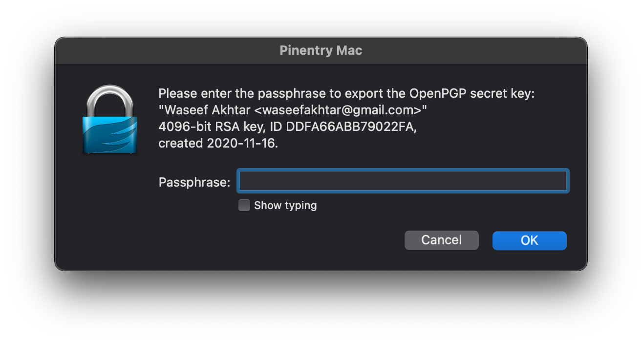gpg --export-secret-keys -o secring.gpg. - When prompted with the passphrase, type the passphrase you set for the key you created.