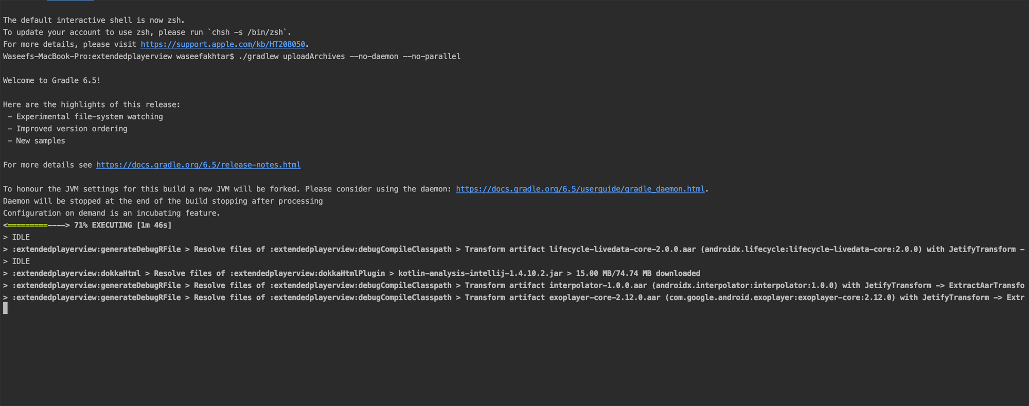 - Type ./gradlew uploadArchives — no-daemon — no-parallel.