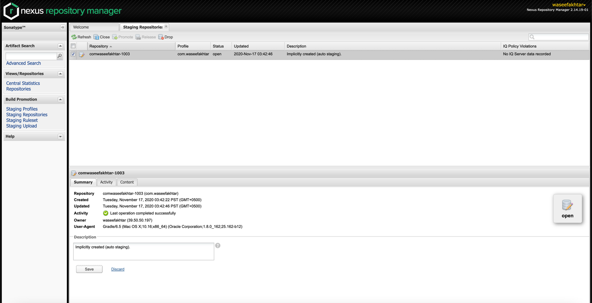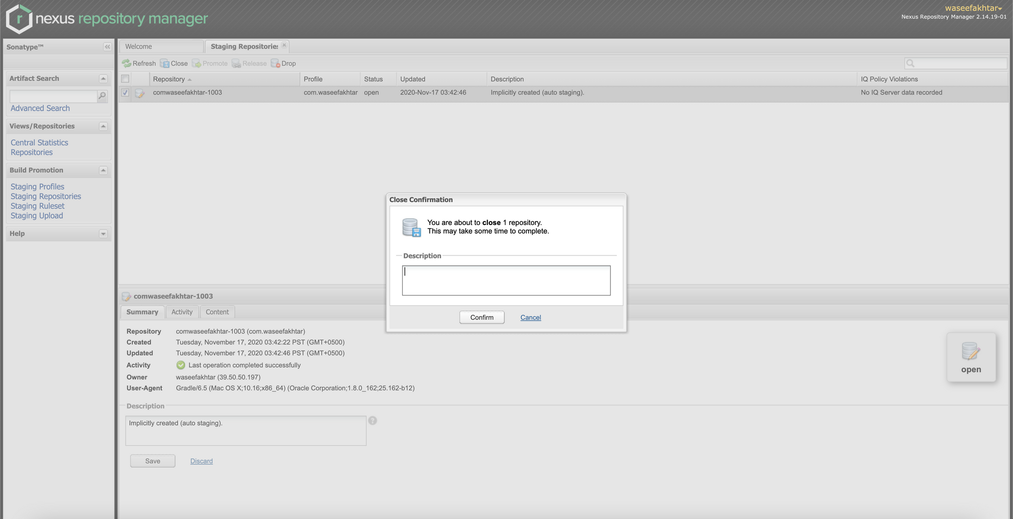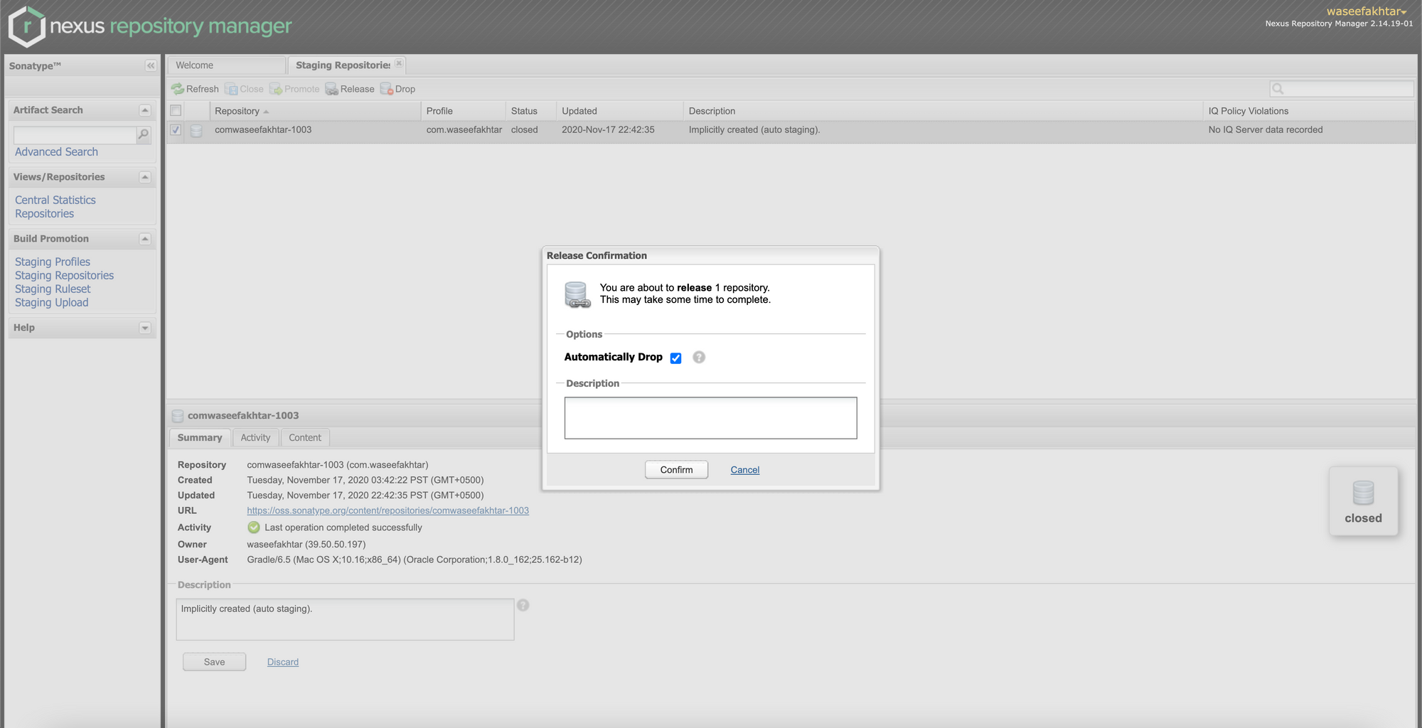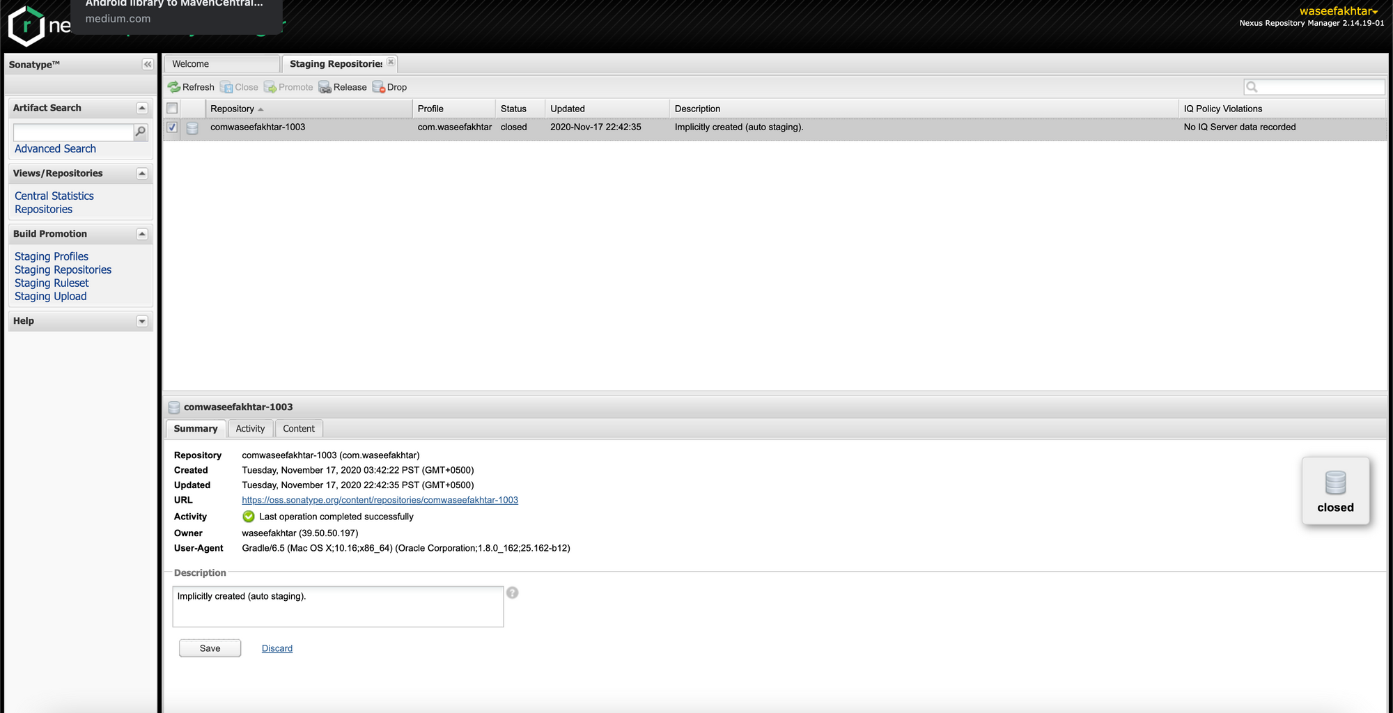 Once the library is finished uploading, you can go to https://oss.sonatype.org/ and under Staging Repositories, you should now see your repository appear.