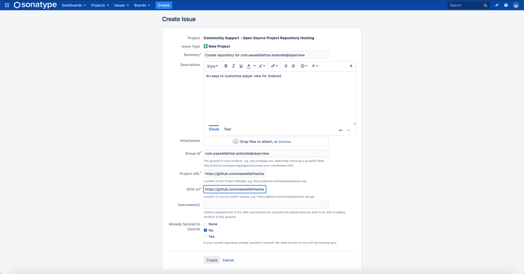 Why create a ticket before publishing your library, you ask? Sonatype provide repository hosting service for open source projects and by creating a ticket, they manually review the information submitted about all new projects.