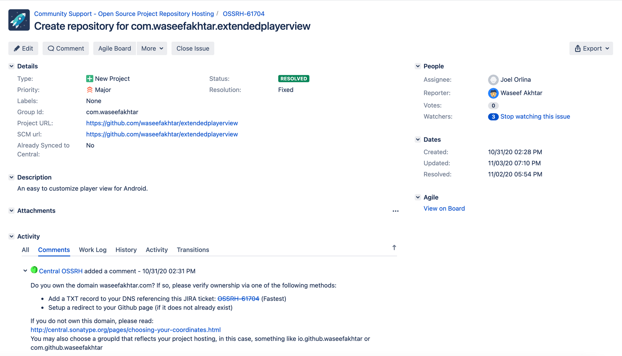 Notice that they ask about the domain name based on the Group ID you’ve mentioned in the ticket description as well as your library, for instance, com.waseefakhtar in my case.